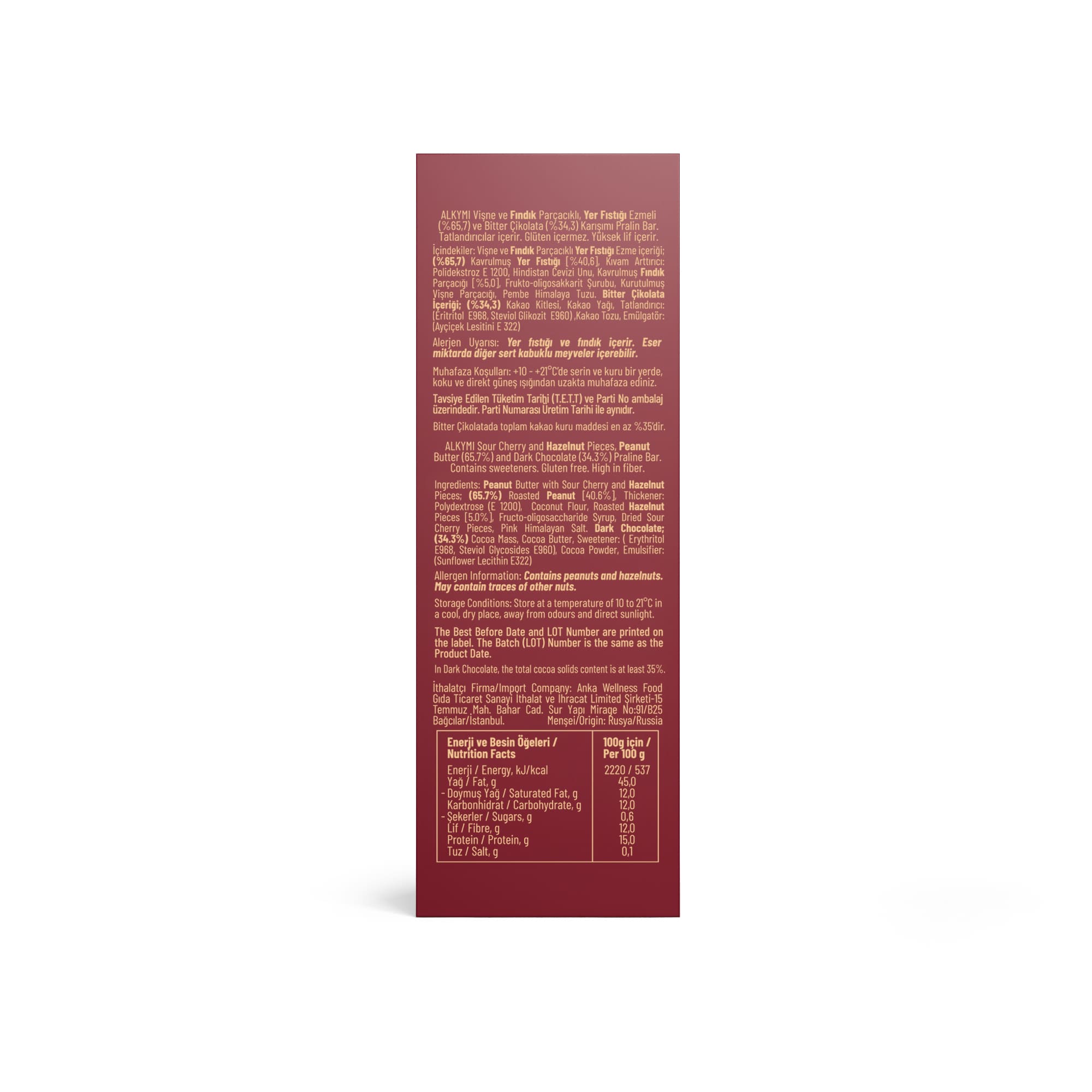 Doğaya ve doğala aşık Alkymi'nin Vişneli Bitter Pralin Bar’ı doğanın armağanlarını en saf halleriyle bir araya getiriyor.Doğanın hikâyelerini lezzet ile hayata geçiren Alkymi’nin Vişneli Bitter Pralin Bar’ı hem bedeni hem de ruhu besleyen bir ödül. Aynı anılardaki gibi; ne zaman yediğini unutursun ama nasıl hissettirdiğini hep hatırlarsın!
